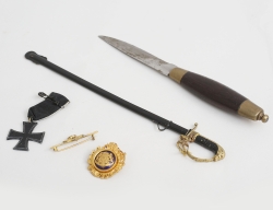 tidigt 1900-tal, längd 23, kniv - blad märkt Frosts Mora, längd 20, brosch Sporrong Stockholm, polerad mässing, riksvapnet mot blå emalj , medalj märkt 1915 "Juvenalorden" (4)