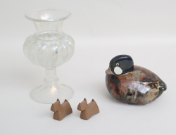 glas, höjd 19,5, figurin glaserat stengods, signerad Timo Sarvimäki Rörstrand Studio, höjd 11, längd 14, 1 par figuriner "Skottar", design Stig Lindberg, höjd 5