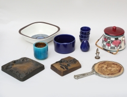 2 väggskulpturer brons, signerade, 14x14, 11x9, skål, ströare och 3 äggkoppar "Blå eld", vas chamotte, Gunnar Nylund, höjd 7, sigillstamp mässing/tenn, i form av hjort, höjd 5, handspegel tenn , längd 23 (glas saknas), karott "Amanda" Rörstrand, skål med lock Deco (krackelyrer)