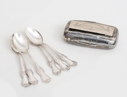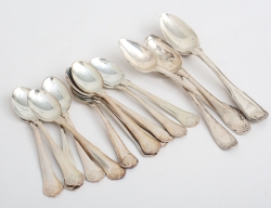 12 kaffeskedar modell sachsisk, Mema 1988, 5 teskedar olika modeller 1800-tal, vikt 278 gram