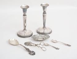 ljusstakar 1 par signerade Löfman, Markströms Uppsala 1982, höjd 16,5, fyllda bottnar, fat genombruten dekor, kaktång, 3 skedar (inskription), vikt 111 gram exklusive ljusstakar