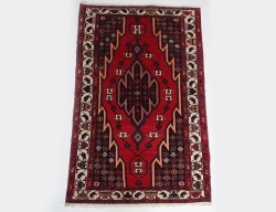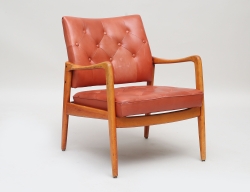 oidentifierad formgivare, stomme i teak, djuphäftad röd skinnklädsel, höjd 75, bredd 68 (smärre bruksslitage)