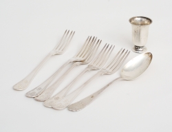 5 bordsgafflar modell gammalfransk, CGH Stockholm 1947, inpressat monogram, dessertsked Markströms Uppsala 1932, bägare 1932, inskription, höjd 5,5, vikt 266 gram