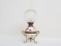 majolika och mässing, kupa i frostat glas, höjd 51