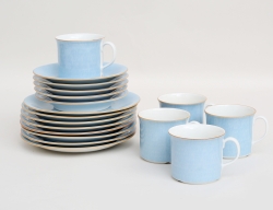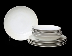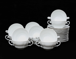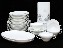 10 mattallrikar, 2 uppläggningsfat samt 6 buljongkoppar med fat, vitt porslin med reliefdekor, diameter 11,5-25, 12 tallrikar med förgylld dekor, diameter 21, vas märkt Peynet, förgylld och svart dekor, höjd 29