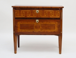 tidigt 1900-tal, mahogny med intarsia, bla meanderbård, två lådor, nyckelbeslag i polerad mässing, höjd 80, bredd 84, djup 45 (nyckel saknas, smärre fanerbortfall)