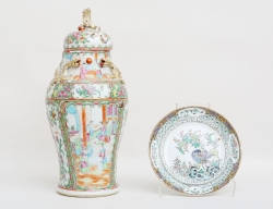 polykrom emaljdekor, höjd 42, diameter 20 (mynning med hårsprickor och naggar, lock med nagg, tallrik med nagg) (2)