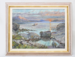 oljemålning på duk, fjordlanskap med båt i solnedgång, signerad, 65x85, rammått 86x106