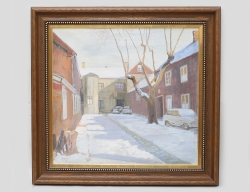 oljemålning på duk, vinterbakgård - Jönköping, signerad -66, 62x66, rammått 80x84 (smärre krackelyrer)