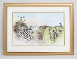 akvarell, ungkråkor på gärdesgård, motivet illustrerat i jakttidning, signerad, 32x49, rammått 51x68