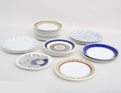 11 assietter "Ylva" Gefle, 4 assietter "Aurora" Gefle, 1 assiett "Eden" Rörstrand (underkantsnagg), 2 assietter "Skotte", 3 tallrikar "Tvist", 3 tallrikar "Lide", Stig Lindberg Gustavsberg, 3 tallrikar "Spalje", Wilhelm Kåge Gustavsberg