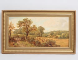 1800-talets senare del, oljemålning på duk, figurer i arbete på fältet, 32x60, rammått 43x72 (ett färgbortfall/krackelyr)