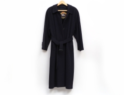 marinblå, ull/caschmere, invändigt sidenfoder, skärp, gott skick, storlek ca. 40/42, rygglängd 128