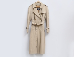 trenchcoat dam, beige, rutigt avtagbart foder i ull, storlek ca. M, rygglängd 114 (obetydligt bruksslitage, smärre fläckar nedertill insida kant)