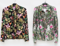 2 blusar, viskos respektive silke, polykroma blomstermotiv, storlek 36 respektive 38