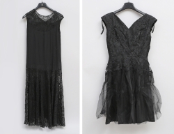 klänning 1920-tal, "Charlestonmodell", svart spets, storlek 40/42, längd 130, klänning 1940/50-tal, märkt Bentgson modell 38, svart spets och tyll, längd 100 (2)