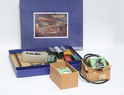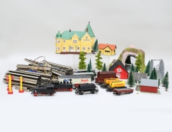 tågbana - 2 lok, vagnar, räls, 5 hus, tunnel, transformator, skisser och beskrivning m.m.