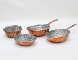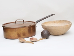 trä, båda med bomärken, längd 16, skål allmoge 1800-tal, trä, diameter 33, senapskula gjutjärn, gryta med lock c.1900, oval, koppar, längd 64