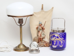 mässing, vit glaskupa, höjd 36, ishink blått glas och vitmetall, höjd 25, väckarur tidigt 1900-tal, höjd 9, väggskulptur keramik, höjd 34