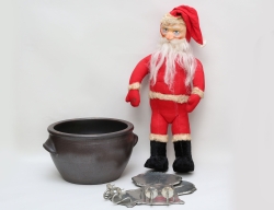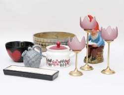 glaserat stengods, höjd 11, 3 ljusstakar mässing och glas, höjd 17-25, skål keramik, Winblad Alingsås, diameter 24, skål Ulrica Hydman Vallien Kosta Boda, höjd 9, tomte bemålad keramik, höjd 34, krus med lock Rörstrand, höjd 12, fat Deco Helsingborg, längd 23