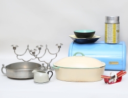 emalj och gjutjärn, längd 33, kandelabrar 1 par, art deco 1931, tenn, höjd 17, skål tenn, GAB Stockholm 1930-tal, diameter 22, brödburk JH Fabrikerna Sävsjö, längd 40, skål emalj, diameter 16, m.m.