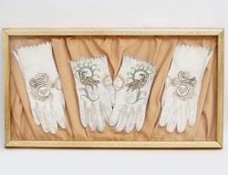 2 par, sämskskinn med broderi, monterade i ram med glas, 31x57