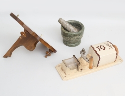 Wilhelm Kåge Gustavsberg, trä, metall och glas, höjd 33, mortel med stöt, kolgårdsmarmor, höjd 10, väggkonsol betsat trä, höjd 21, 30x16