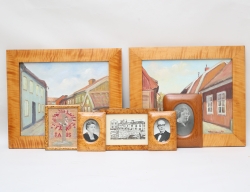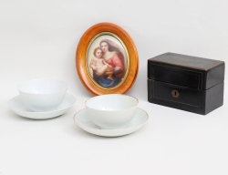 stämpel i godset, monogramsignerad (?), ram i polerat trä med mässingskant och konvext glas, 18x15, 3 flakonger glas med förgylld dekor, i träschatull med intarsia, höjd 10, bredd 15x8,5, 1 par skålar med fat Kina, Qianlong 1736-1795, höjd 5,5 fat med nagg, en skål lagad)
