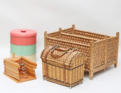 galgar på väggställning Wick 1960-tal, bok, märkt P. William 6 Co AB Bromma, höjd 32, bredd 42, kakburk i 3 sektioner 1950/60-tal, höjd 24, korg c.1900, mässing och läderdetaljer, längd 25, höjd 22, spånkorg c.1900, 40x34, höjd 26