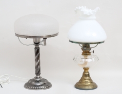 mässing, vit glaskupa, höjd 45, bordslampa sent 1900-tal Ståks Armatur, patinerad metall, glaskupa, höjd 40 (2)