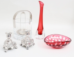 glas och rostfritt stål, höjd 20, diameter 14, skål signerad Boda, längd 18, vas rosatonat glas, höjd 28, 1 par ljusstakar rokokostil, pläter