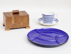 1920/30-tal, läder med förgylld dekor, höjd 12, bredd 17,5x12,5, tekopp med fat "Lillemor", Arthur Percy Gefle, höjd 8, tallrikar 1 par "Silit", Riedlingen Tyskland, emaljerad metall, diameter 25