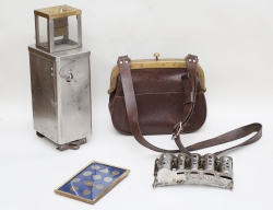 1900-talets första hälft, myntautomat längd 17, myntbössa plåt/mässing, höjd 34, konduktörsväska läder/mässing, bredd 25, 11 olika mynt bakom ram och glas