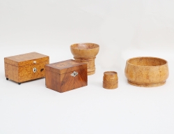 2 sandströare höjd 10/5, skål höjd 7, diameter 14, 2 skrin varav ett med nyckelskylt och knopp i ben, och ett i valnöt, höjd 8/7,5, bredd 13/11, samtliga föremål av björkrot
