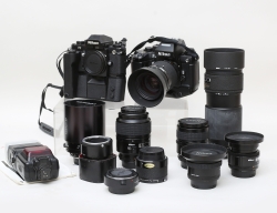 digital systemkamera Nikon F4, objektiv, blixt och tillbehör m.m., originalkartonger, (kamerahuset med läckage i LCD displayen, lös lins på objektiv AF 800-200mm.) analog systemkamera Nikon F3 medföljer (sökaren med stötskada)