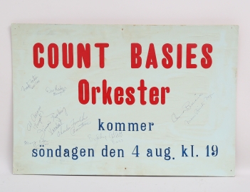 affisch uppklistrad på kartong, inför deras framträdande i Huskvarna Folkets Park 4 augusti 1954, med bandmedlemmarnas autografer, framträdandet omnämns i Huskvarnas Hembygdsförenings årsbok, 39x58, skyddsram medföljer, (sex små hål i marginalen, smärre slitage, luftbubblor)