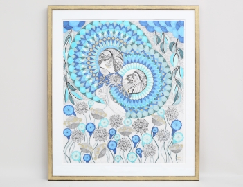 akvarell, stiliserande figurer och blommor, signerad Athulya 10/01/2020, bildmått 63x54, rammått 79x68