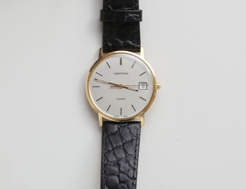 diameter 33 mm, quartz, urtavla med stavindex, datum, svart läderarmband (ej original)  fungerar vid katalogiseringstillfället, originalbox (smärre brukssslitage)