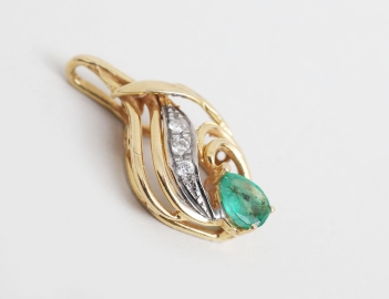 fasettslipad droppformad smaragd, tre briljantslipade diamanter ca. 0,06ct., vikt 1,51 gram, höjd 2