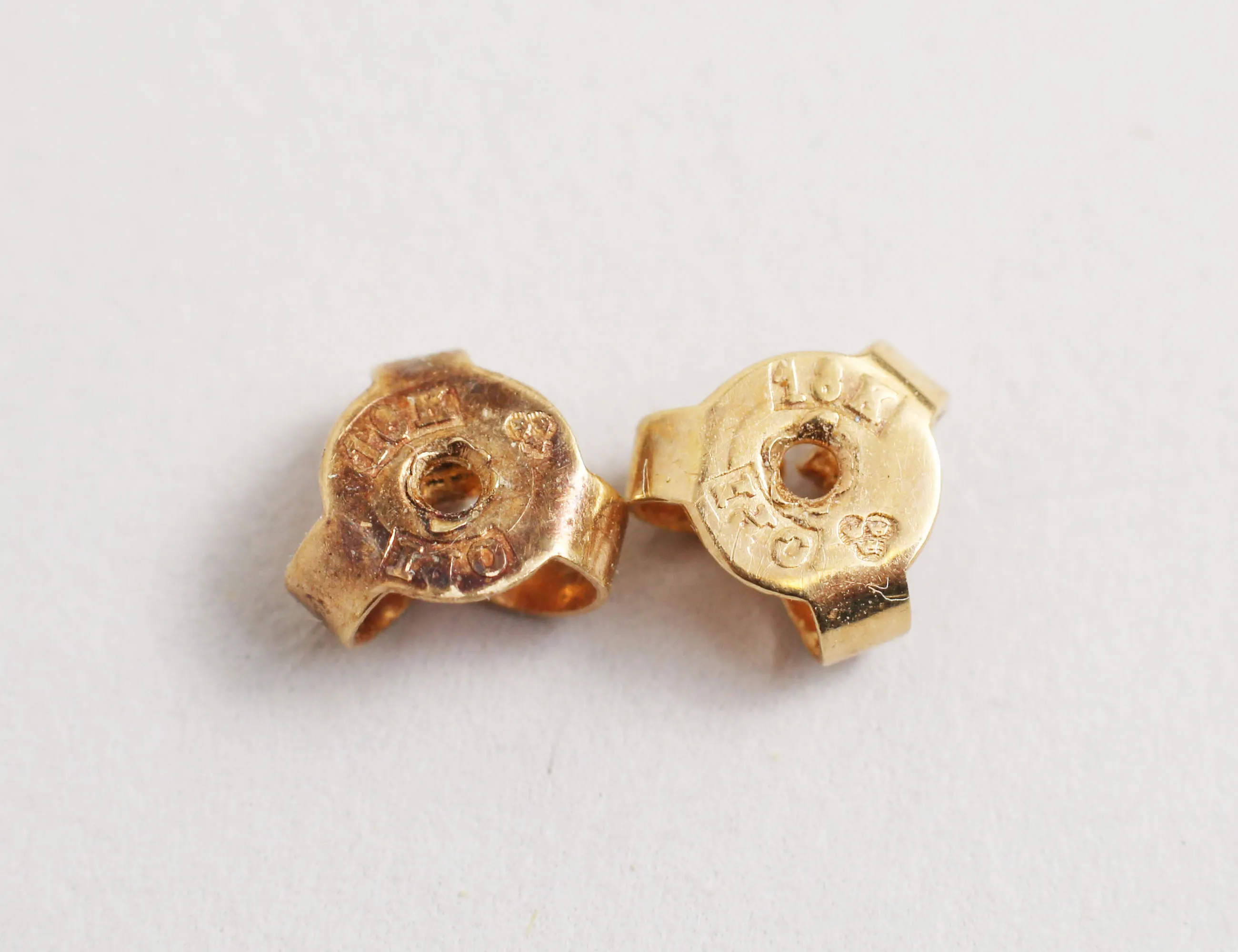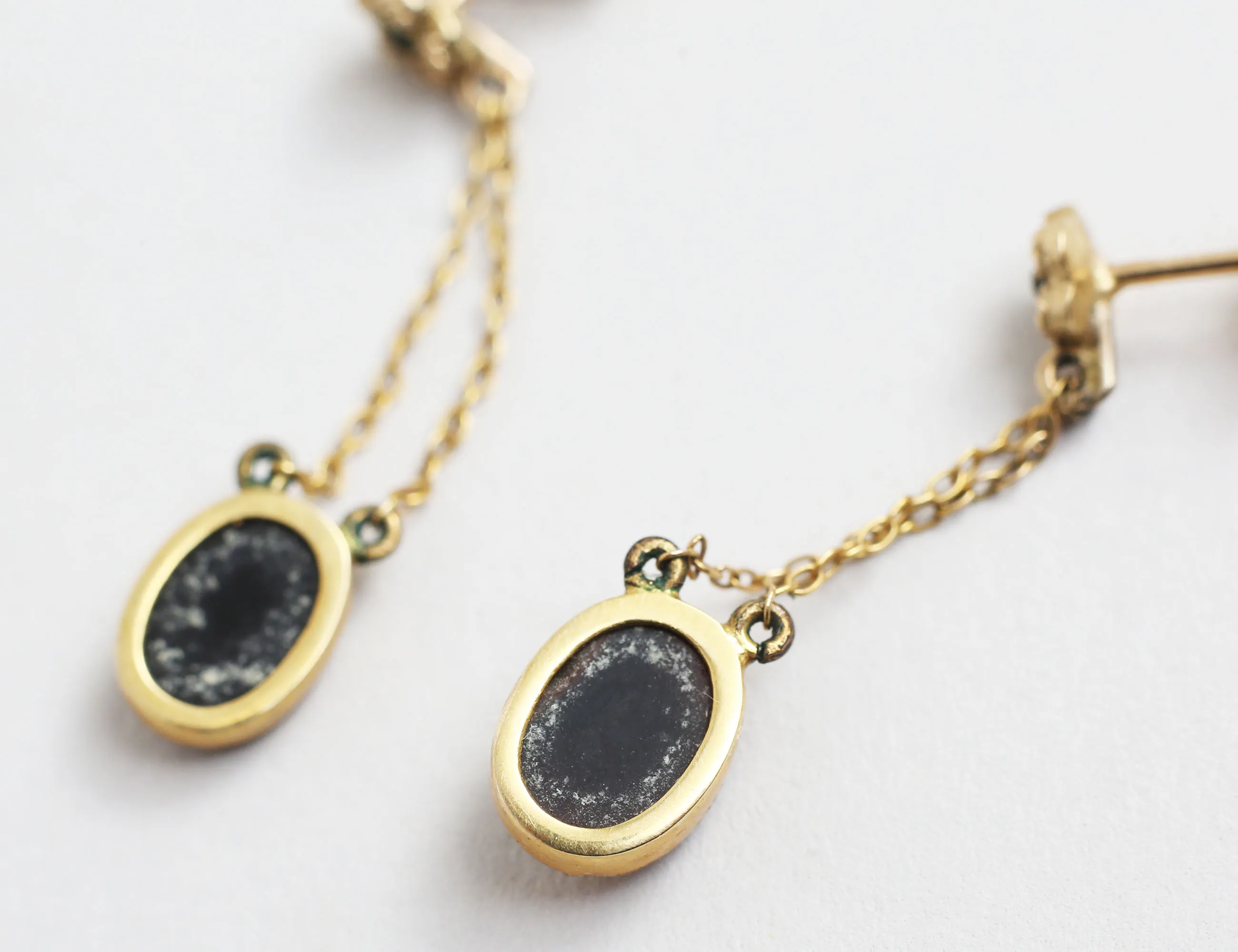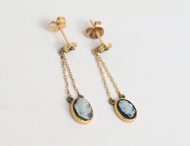 glascaméer med kedjor monterade i blomma, omarbetade till stift i 18k, trolig originalask märkt: Toronto, vikt 1,86 gram