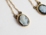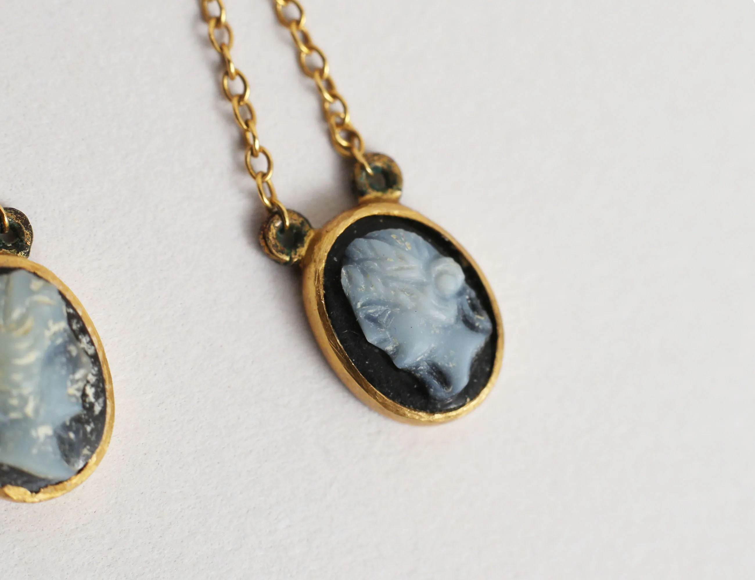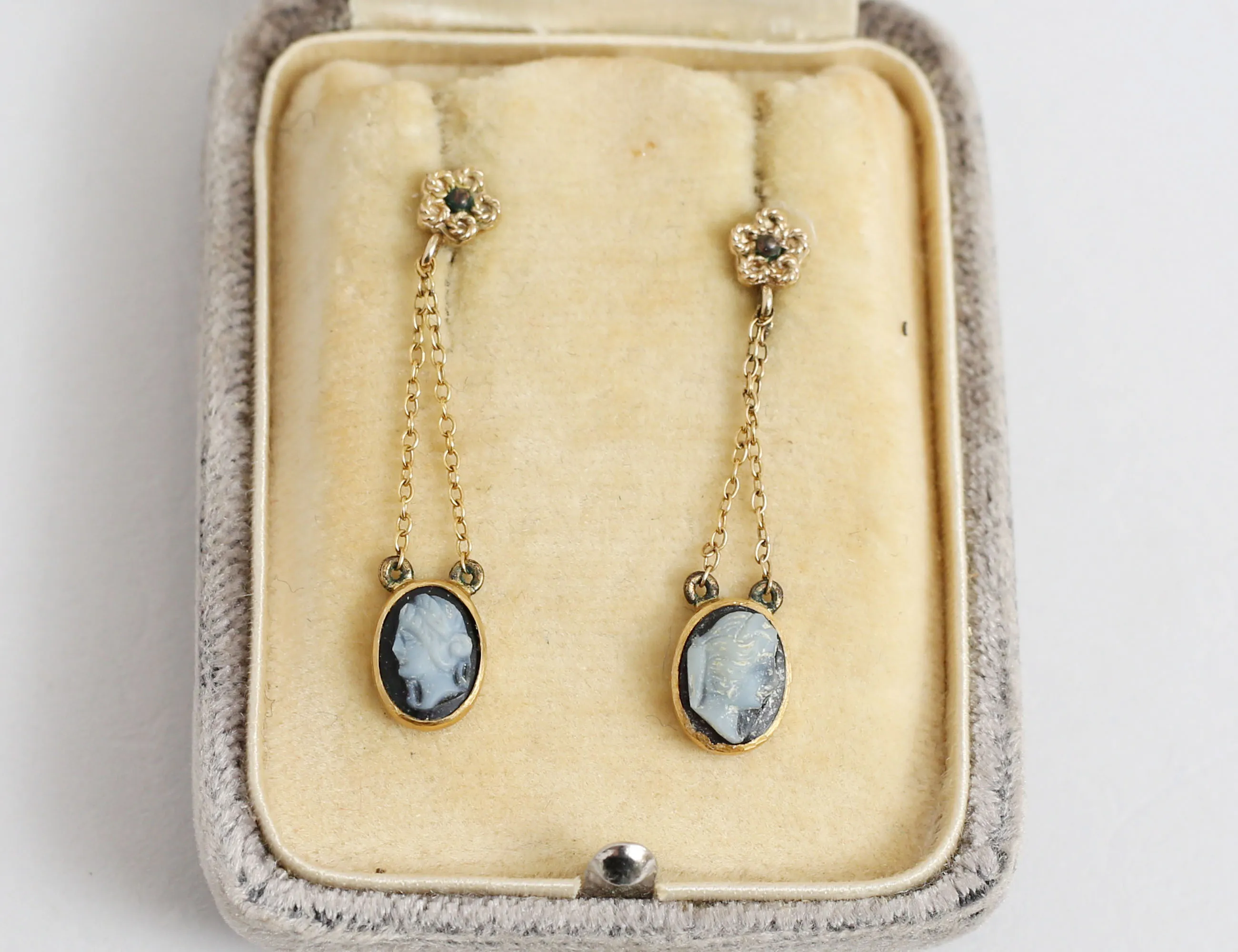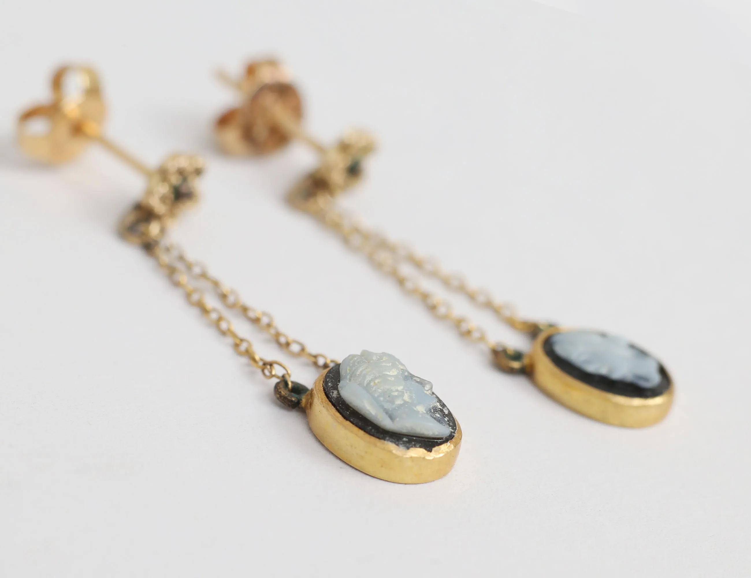 glascaméer med kedjor monterade i blomma, omarbetade till stift i 18k, trolig originalask märkt: Toronto, vikt 1,86 gram