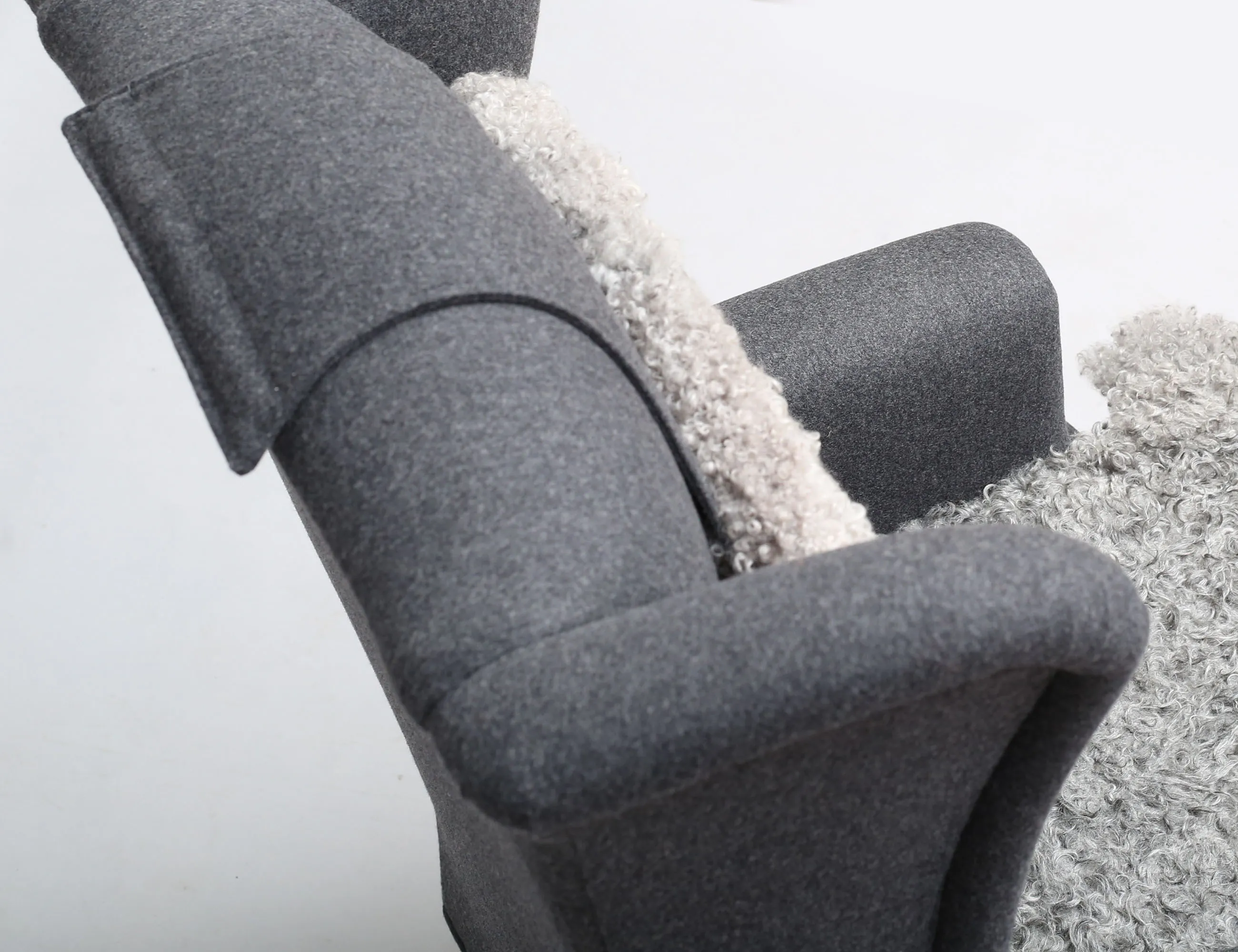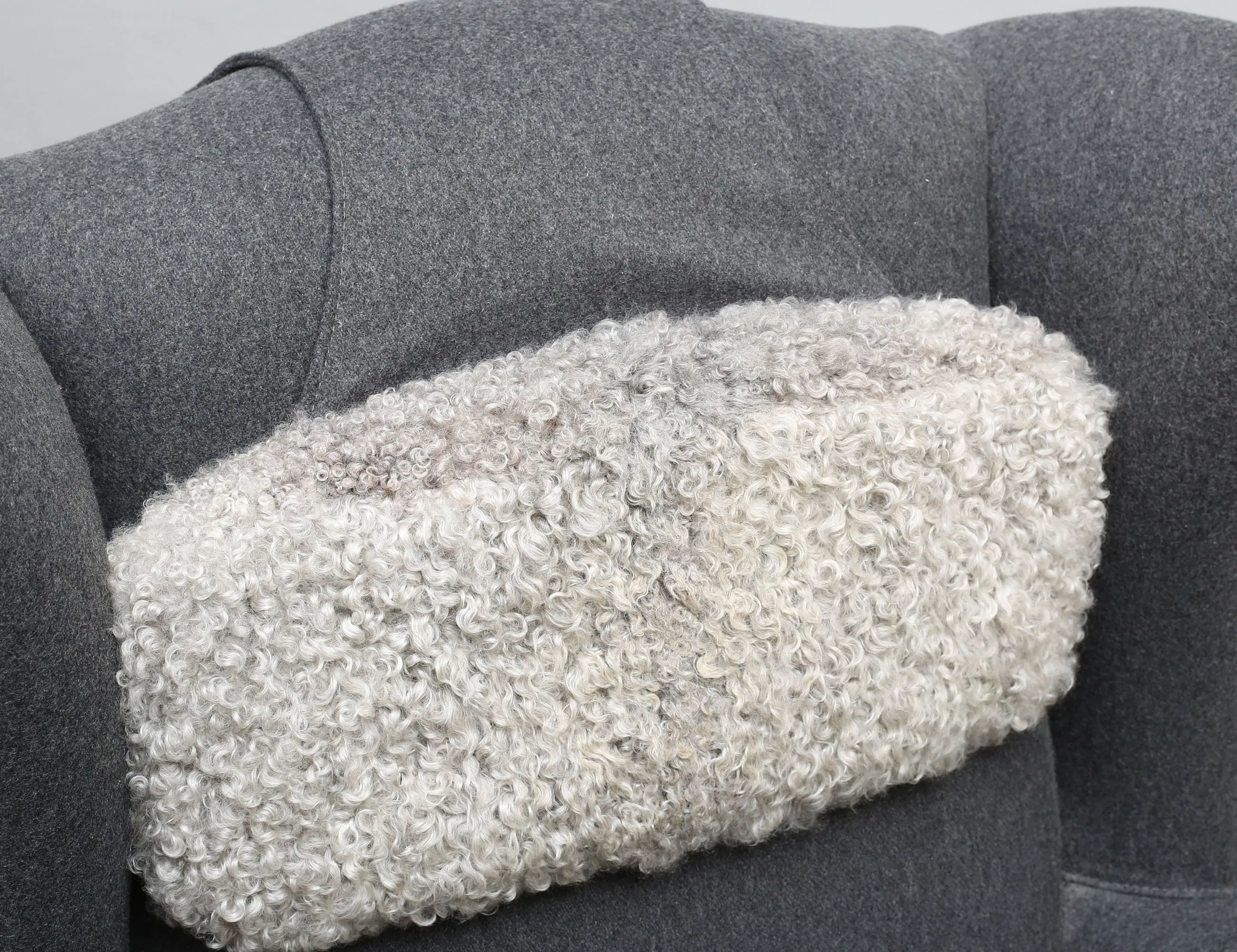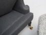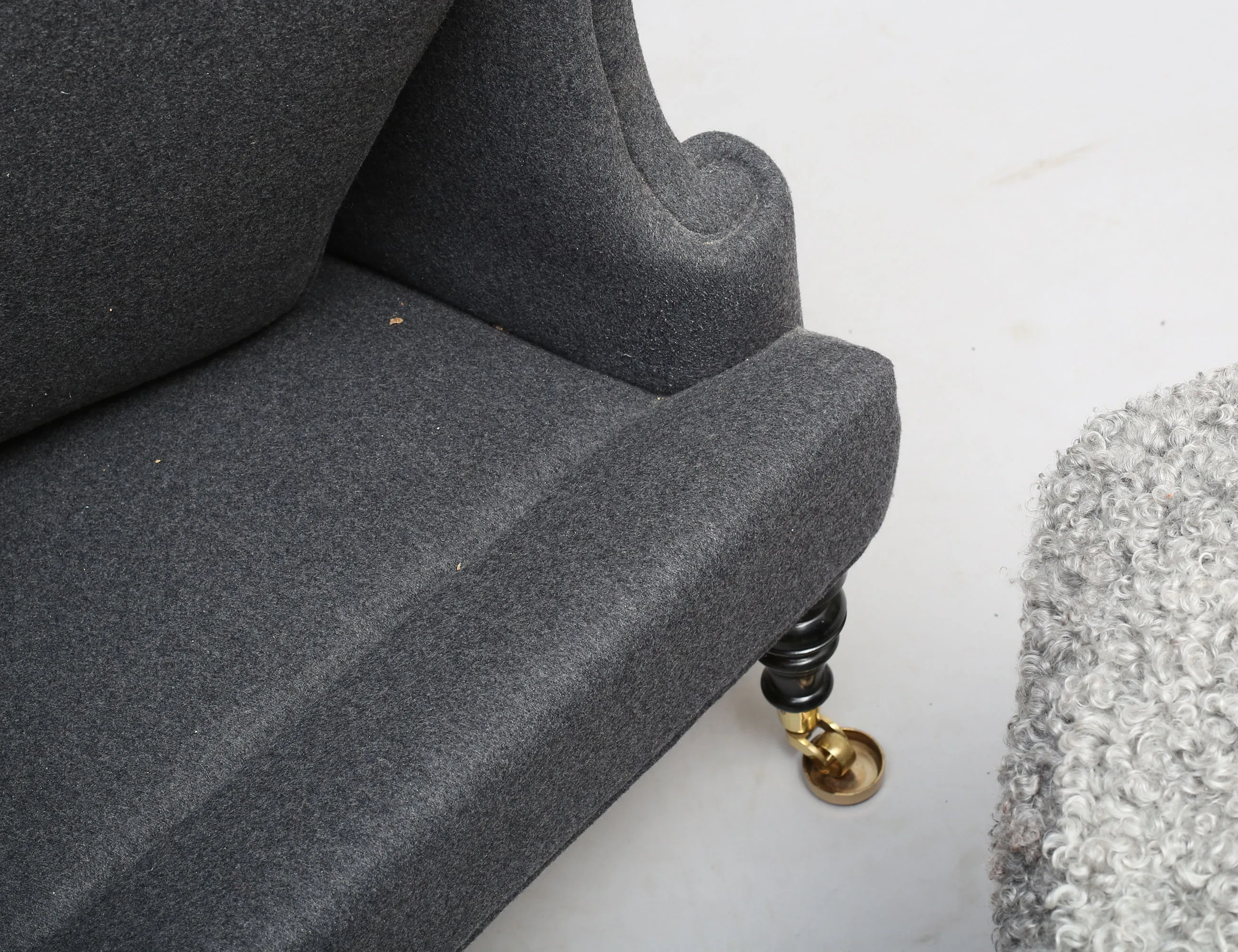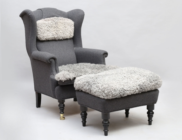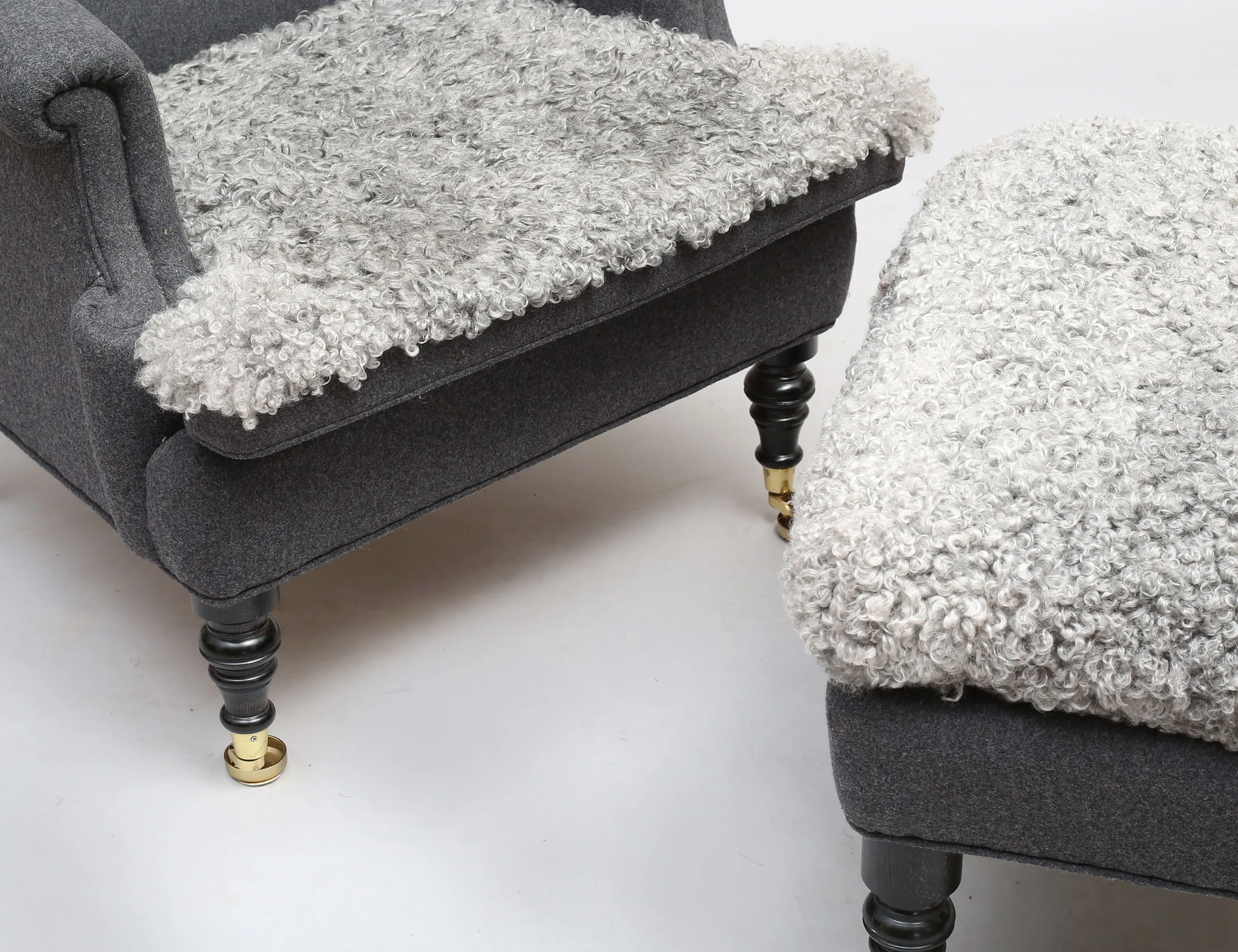 JIO-möbler "Edward modell", grå ylleklädsel med nackkudde och dyna i fårskinn, svarvade framben på hjultrissor i mässing, fotpallen med lös dyna i fårskinn, svarvade ben, höjd 105, bredd 68, pall höjd 43 (obetydligt bruksslitage)