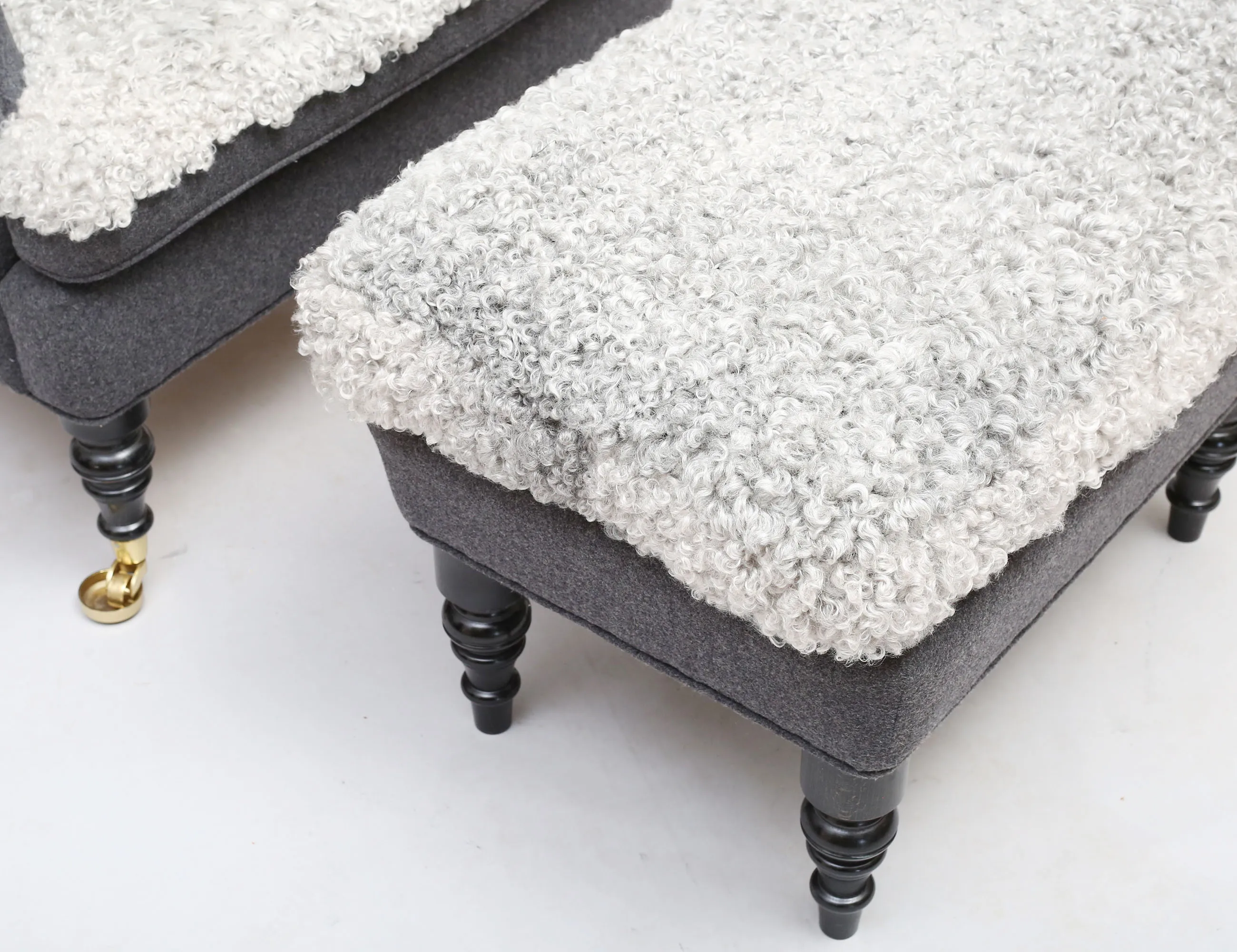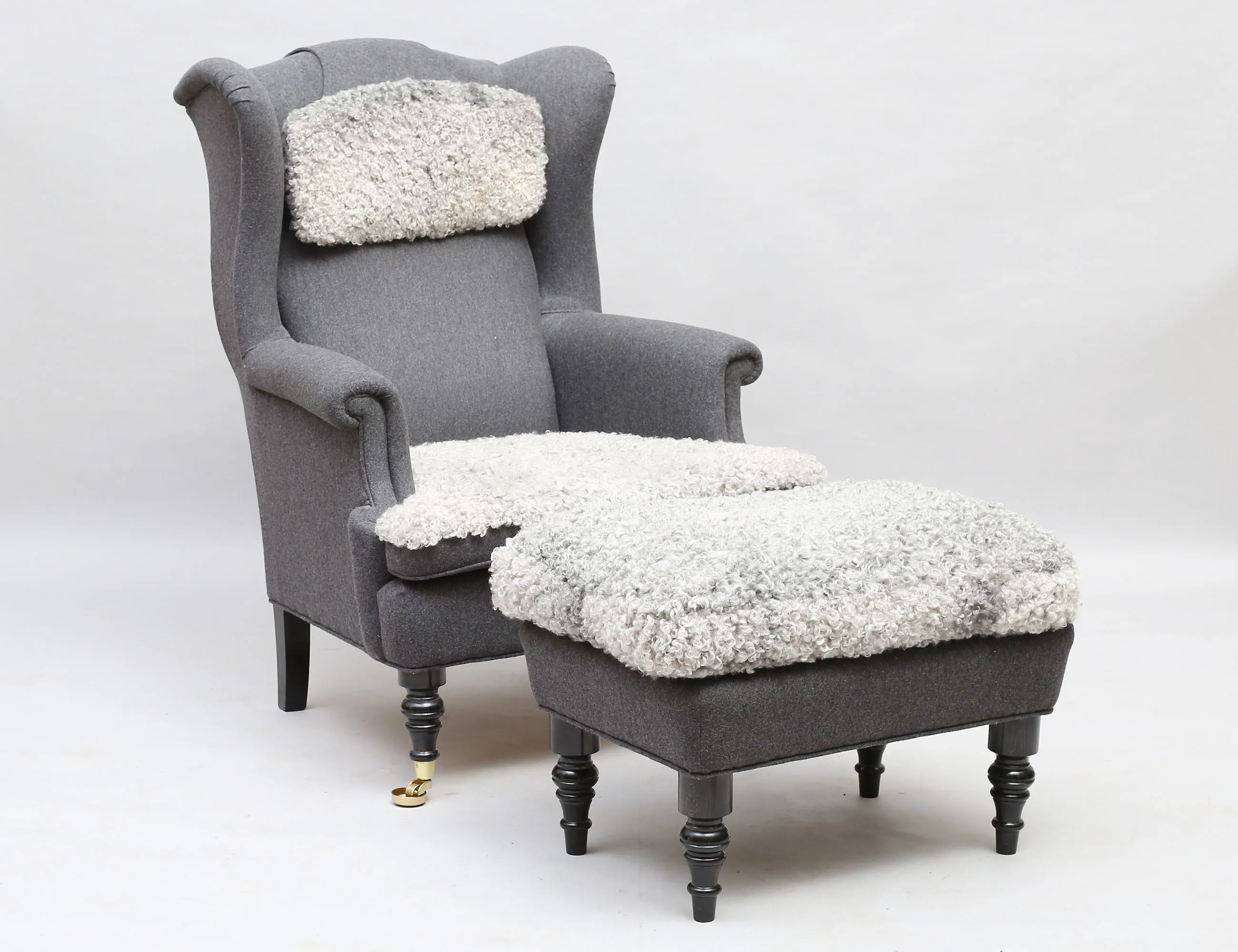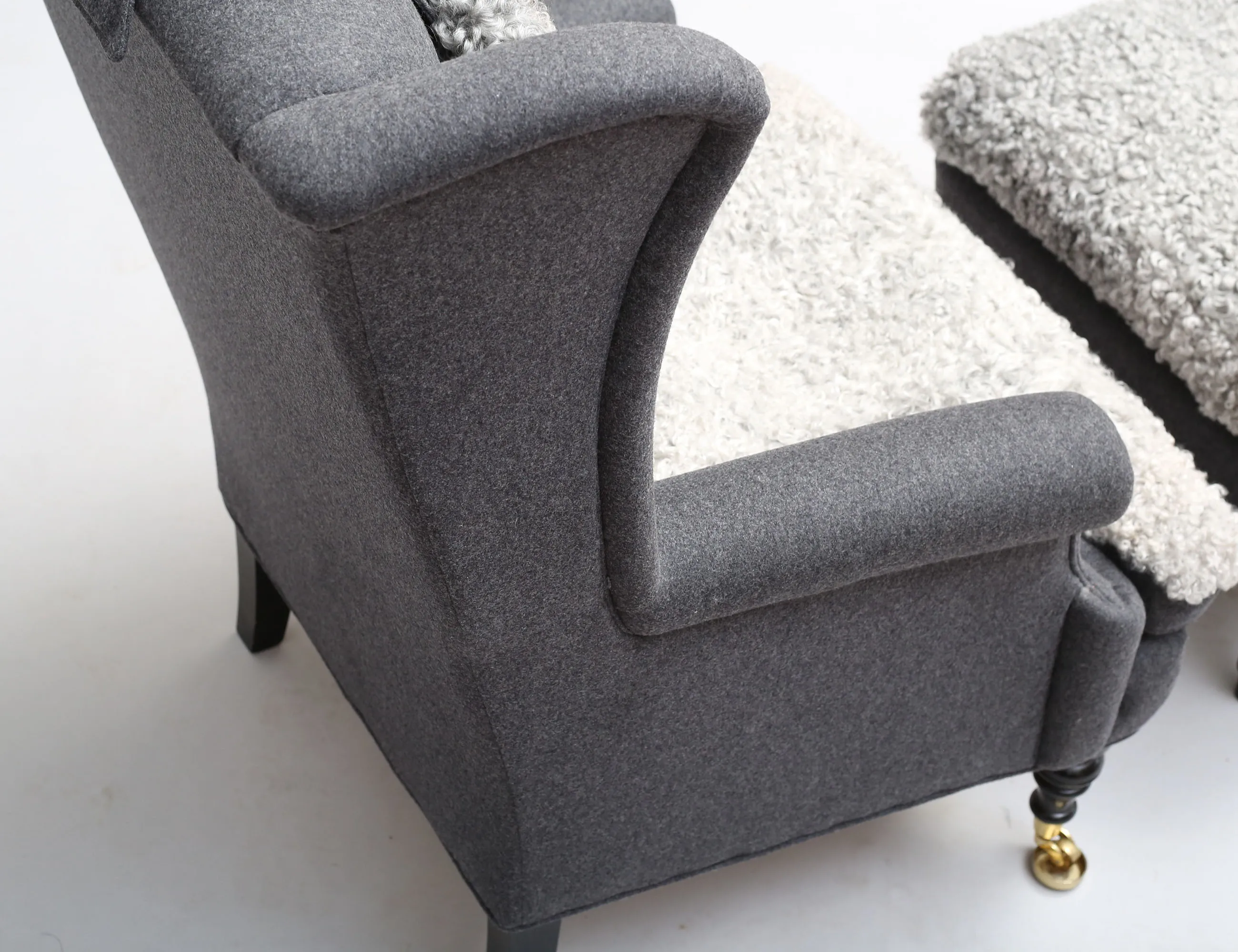 JIO-möbler "Edward modell", grå ylleklädsel med nackkudde och dyna i fårskinn, svarvade framben på hjultrissor i mässing, fotpallen med lös dyna i fårskinn, svarvade ben, höjd 105, bredd 68, pall höjd 43 (obetydligt bruksslitage)