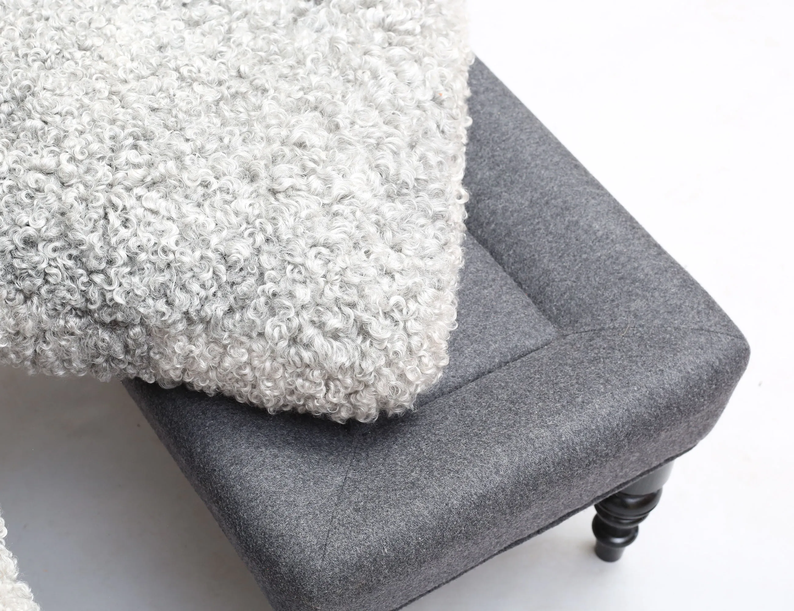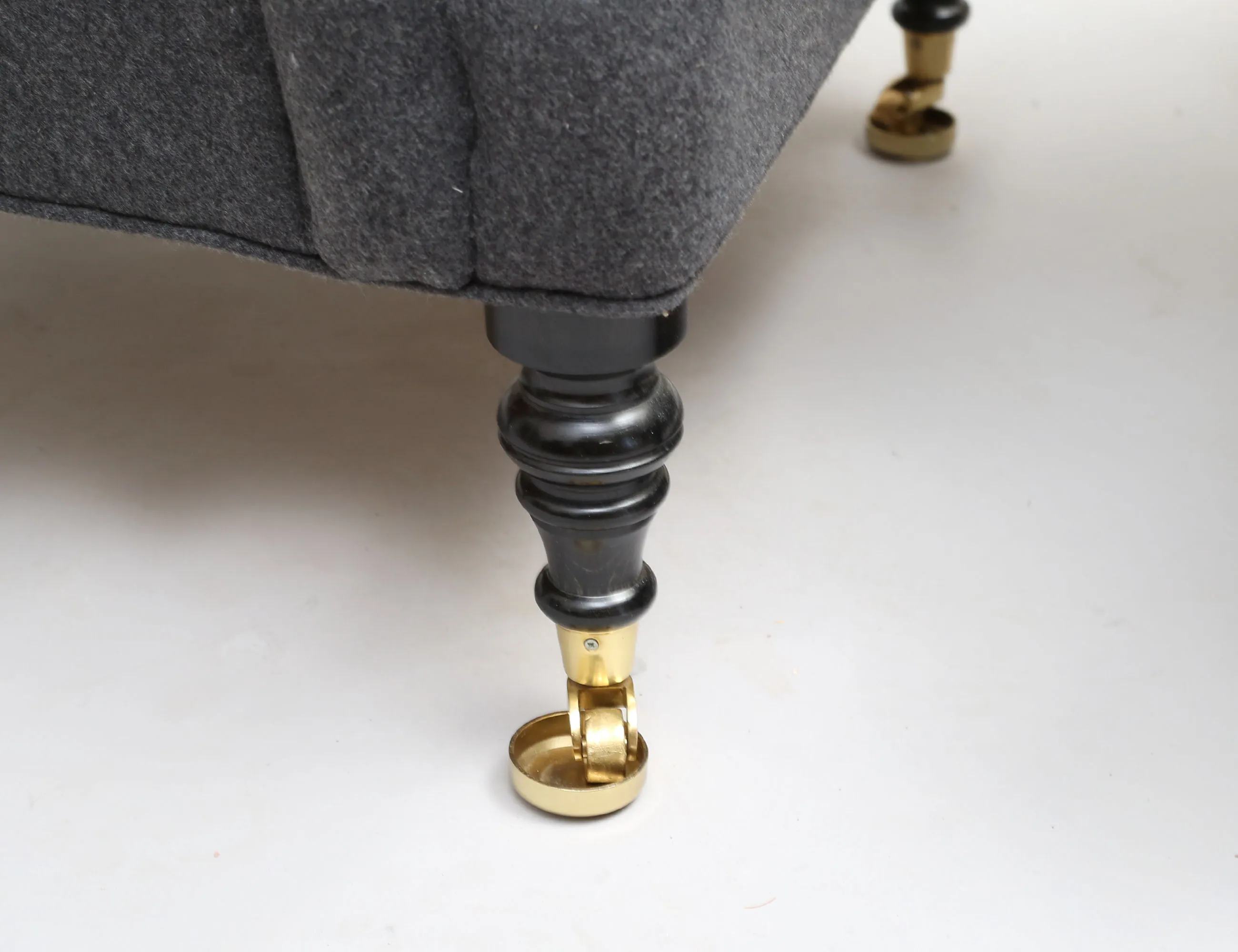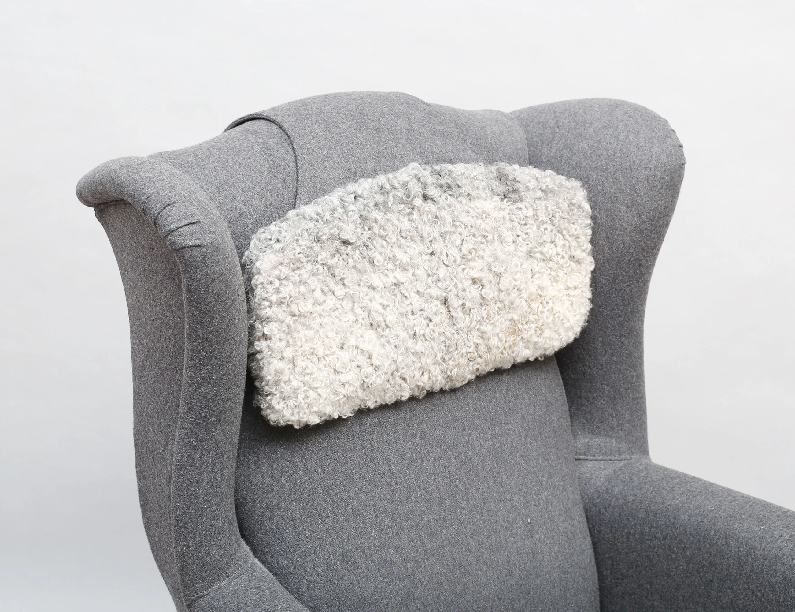 JIO-möbler "Edward modell", grå ylleklädsel med nackkudde och dyna i fårskinn, svarvade framben på hjultrissor i mässing, fotpallen med lös dyna i fårskinn, svarvade ben, höjd 105, bredd 68, pall höjd 43 (obetydligt bruksslitage)