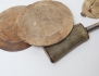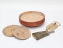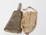 krutflaska daterad 1840, horn, hals i silver, längd 20, Jacob Fredrik Gravander Lidköping, krutpåse sämskinn, skål på fot monogramstämplad, 2 tallrikar trä allmoge, höjd 8,5, diameter 23/17