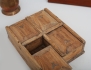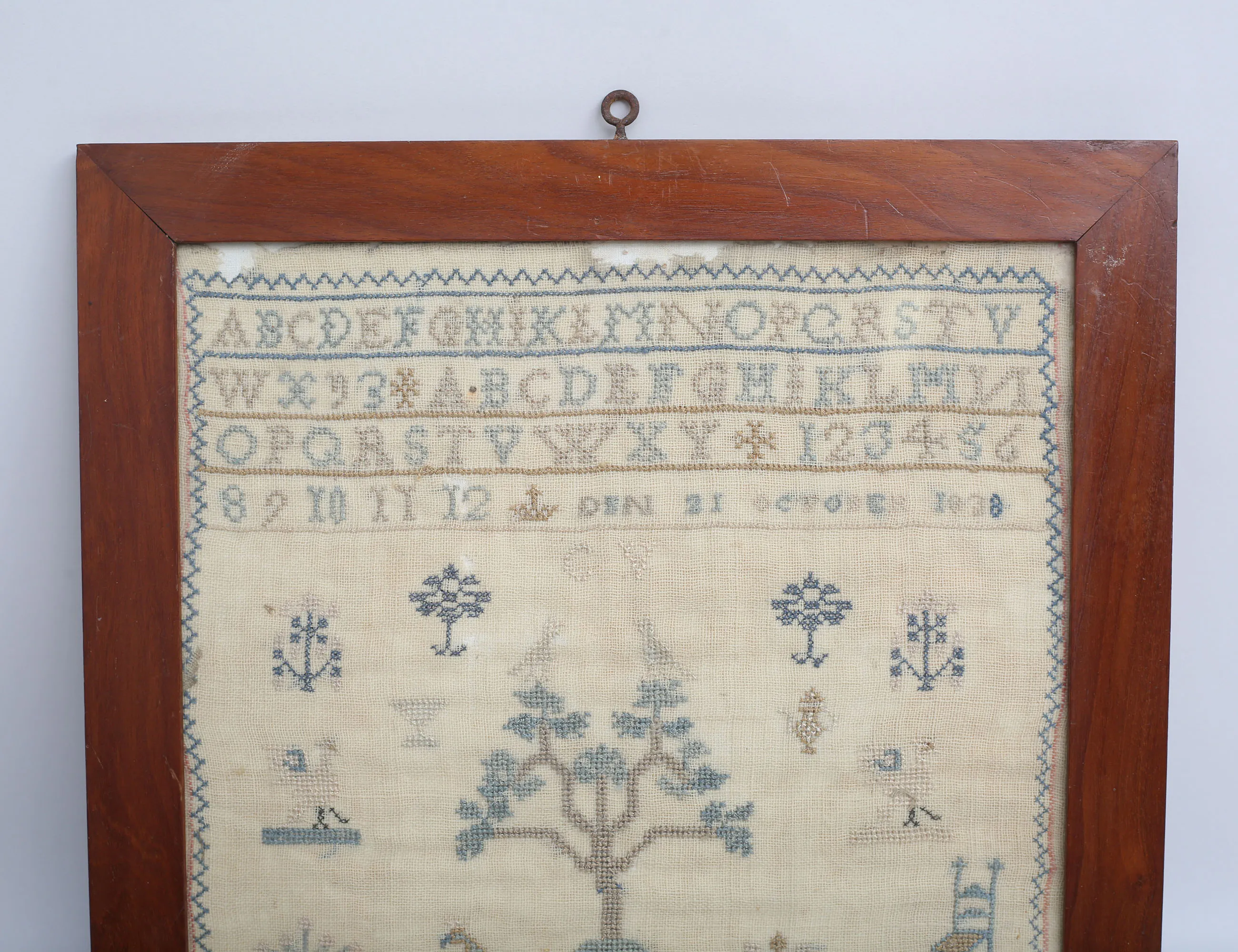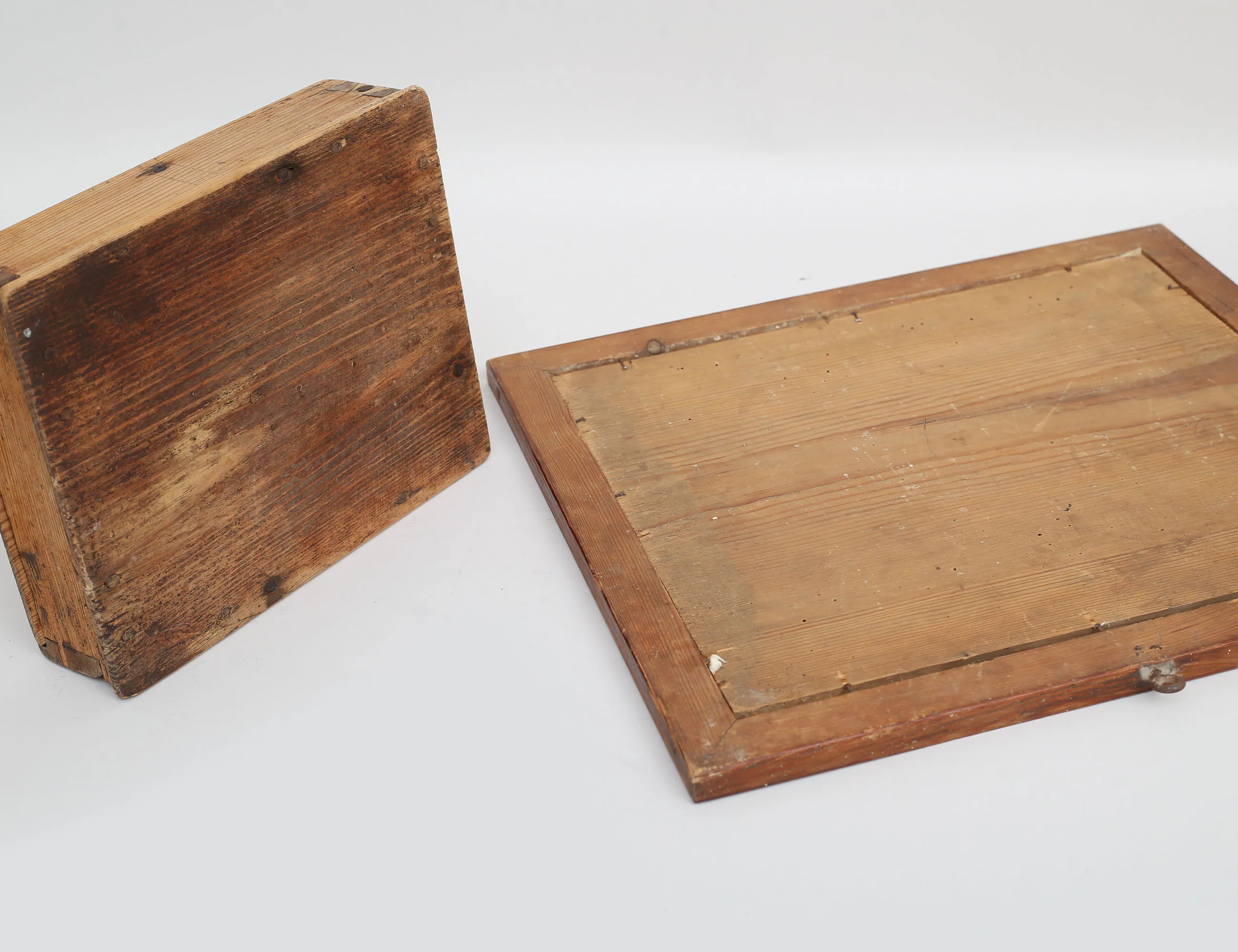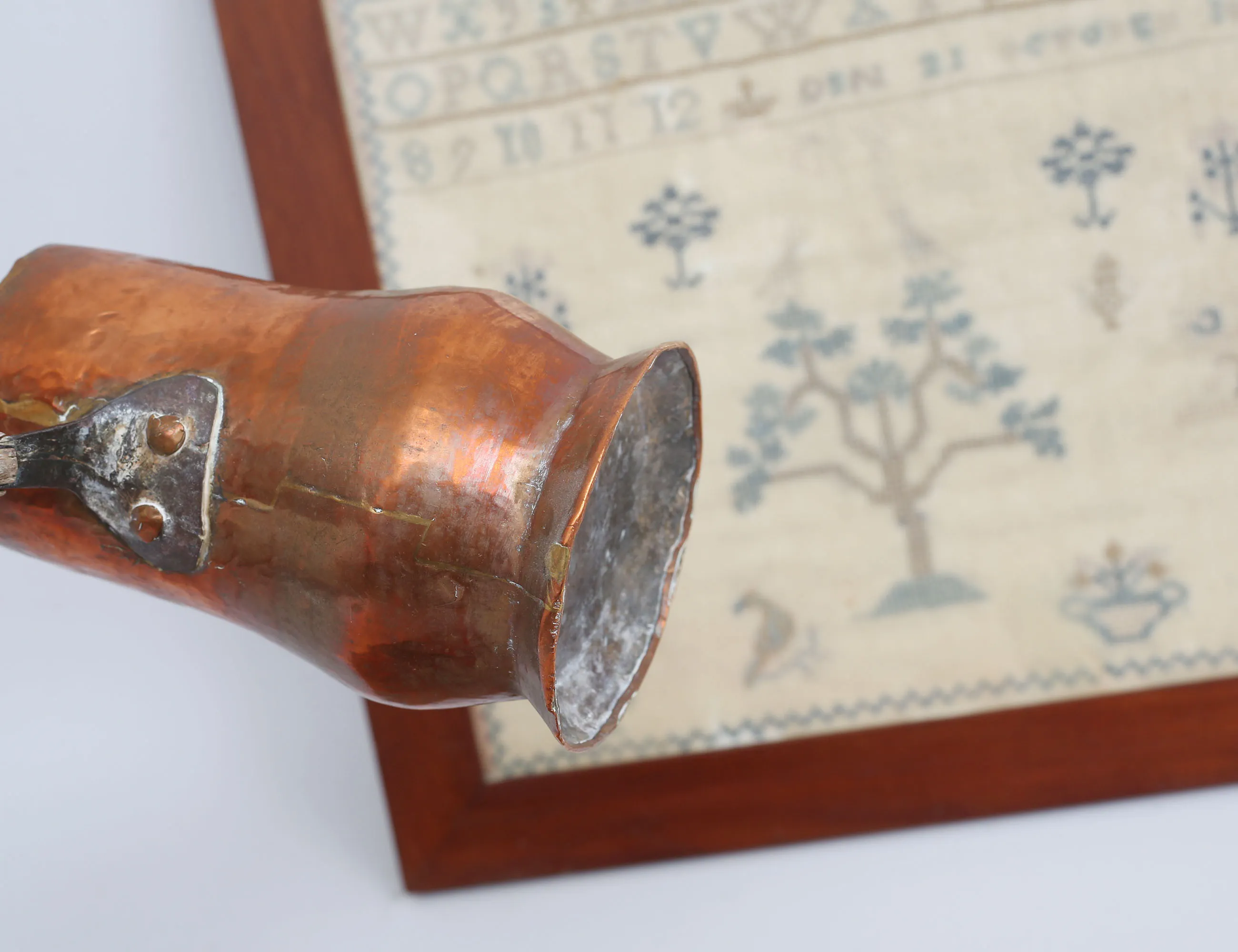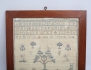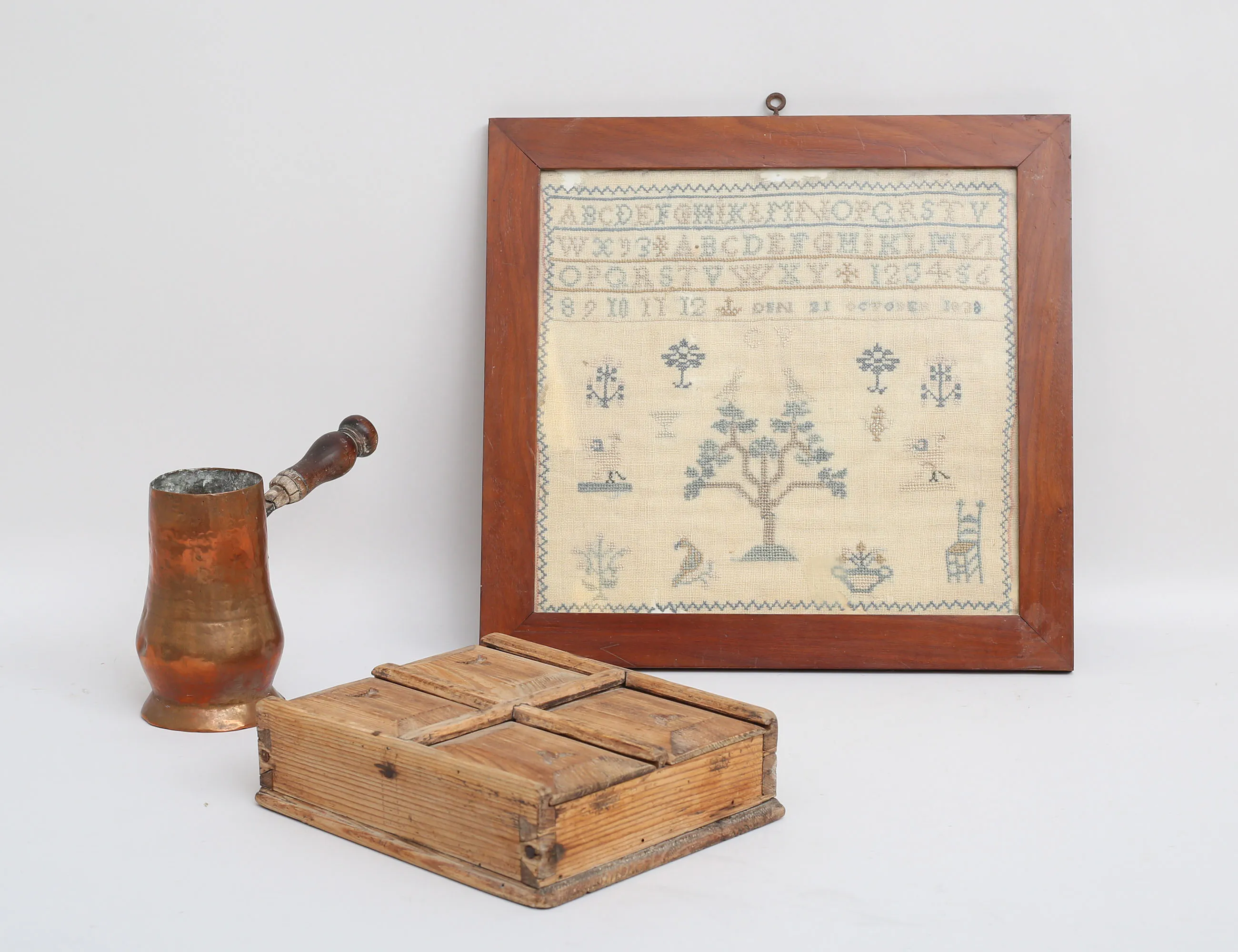 märktavla korsstygn 1838, samtida ram och glas, 36x34, skjutask furu, fyra fack, 21x18, kanna koppar, trähandtag, höjd 14