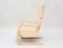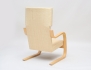 fåtölj modell 401, Artek, skiktlimmad och formpressad björk, klädsel i bast, läderklädda knappar i ryggen, höjd 97, bredd 62 (benställning med smärre märken/fläckar)