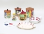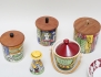 3 burkar med teaklock "Vår lilla Stad", ströare "Familjen Pepparsson" - JIE, höjd 10-16, Marianne Westman Rörstrand, skärbräda "Picknick", längd 19, karott "Frisco" Rörstrand, läng 22, fat "Krokus" Grantofta, burk med lock "Sill", E. Jarup Deco, höjd 15