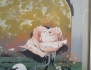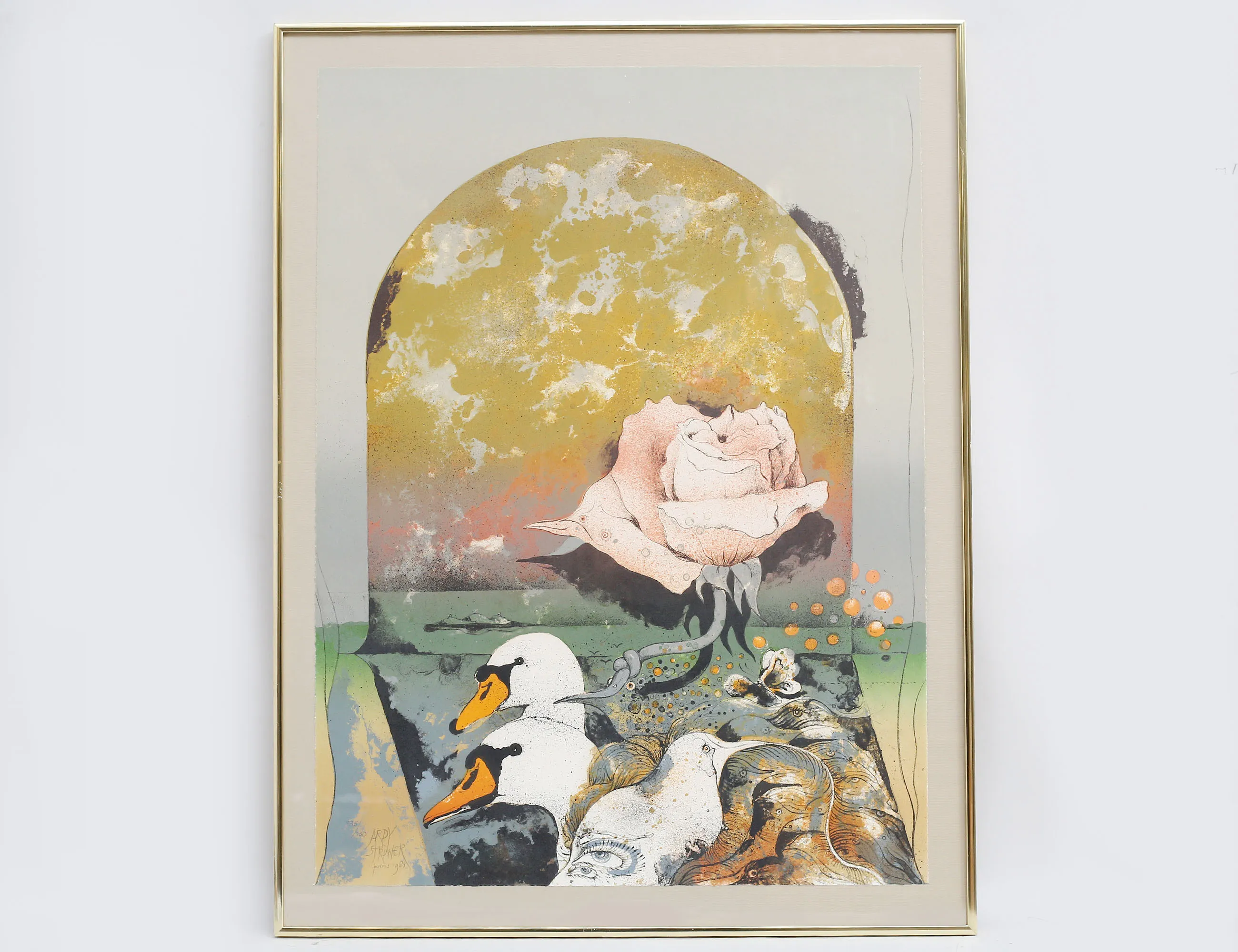 färglitografi 135/150, svanar och ros, signerad Paris 1985, 75x56, rammått 84x64