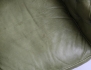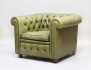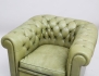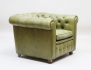 fåtölj chesterfieldmodell 1960/70-tal, olivgrön skinnklädsel, djuphäftad med knappar, bakre ben med hjul, etikettmärkt, höjd 70, bredd 98, djup 90 (bruksslitage, smärre fläckar)